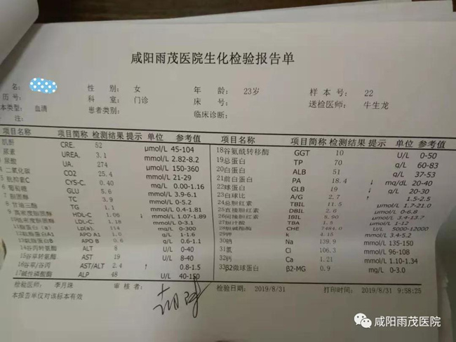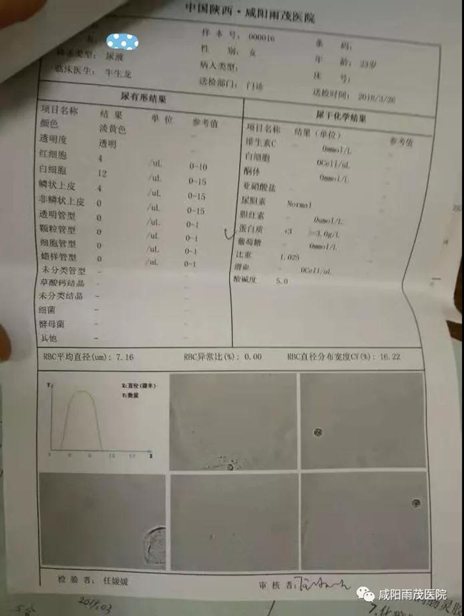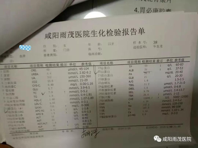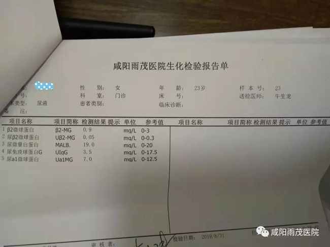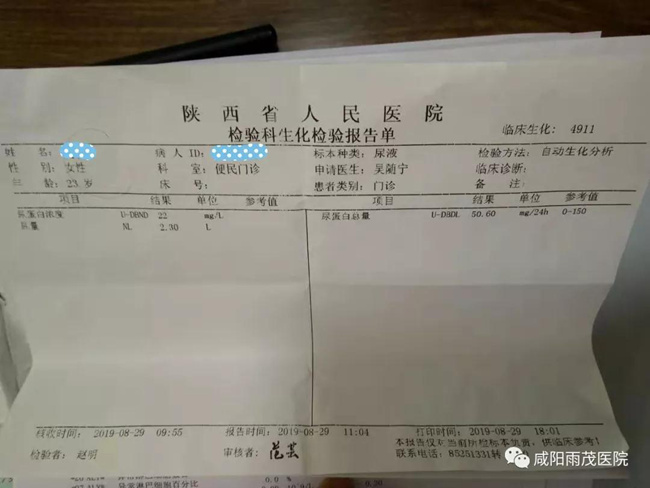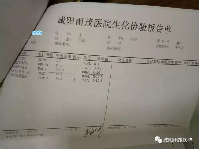 更新日期:2019-09-03 已浏览:4999次曹某某,女,22岁,陕西西安人。确诊“丨期膜性肾病”2月。多次在陕西省某医院口服金水宝,肾复康片,雷公藤多甙片等药治疗半年余乏效。与2018年2月8日在上医院查尿常规,PRO+3,BLD十2,上皮细胞16.5/UL,RBC27.2uL,24小时尿蛋白定量:6055.20mg,故于2018年2月26日来我处诊治。症见:双眼脸浮肿,双下肢水肿,指压肿(十),腰膝困乏,纳差乏力,大便调,尿尚利但量少。舌质淡红,舌苔白,脉沉滑数。西医诊断:慢性肾炎.I期膜性肾病。中医诊断:水肿(阴水证),脾肾气虚。治法健脾益肾,利水消肿,佐以活血化瘀。方用党参,黄芪,生白术,云苓,山药,生地,泽泻,山萸肉,怀牛膝,生益母草,车前草,石韦等药配伍,随症加减,配合我院制剂二黄消白胶囊3粒3次,治疗一年余,患者症状消失,尿检正常,(陕西省医院2019年8月29日查24小时尿蛋白定量50.60mg),已经巩固近半年,现已经停药观察!患者高兴,我快乐!下面附前后对照报告单: