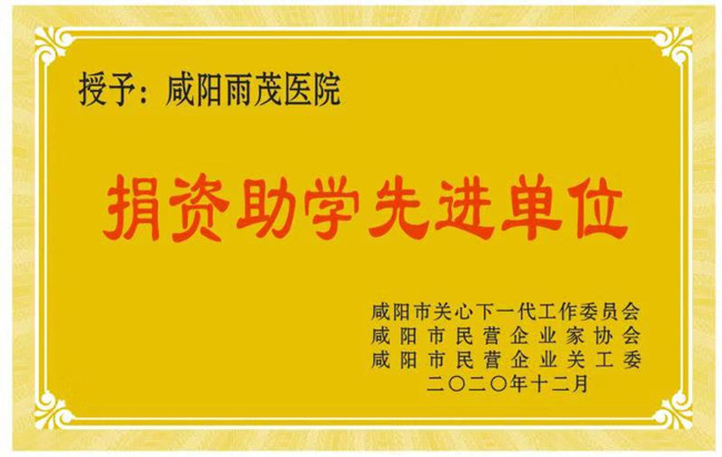 咸阳市关心下一代工作委员会,咸阳民营企业家协会,咸阳民营企业家协会关工委向咸阳雨茂医院赠牌“捐资助学先进单位”。