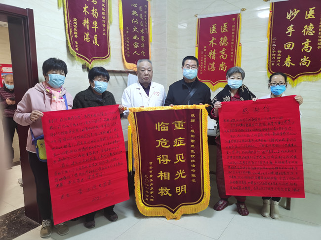 更新日期:2021-04-10 已浏览:2376次4月10日上午,患者景某将一面写有“临危得相救 重症见光明”的锦旗及一份感谢信送到咸阳雨茂医院杜治锋院长手中,以此表示感激之情,并连声称赞院长医术精湛,医护人员对待病患如同亲人一般。