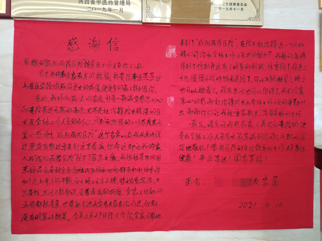 一面锦旗满载着患者的信任与寄托,一份感谢信饱含着患者的感激之情。你给我信任,我还你健康。咸阳雨茂医院全体医护人员将用高尚的医德和精湛的医术继续更好的为大家服务,认真、仁心、仁爱地对待每一位患者。