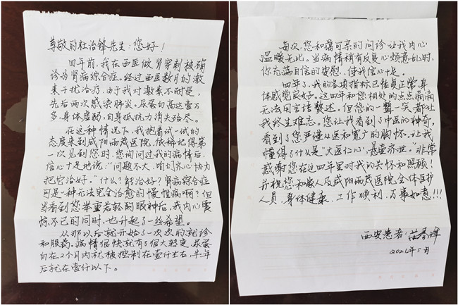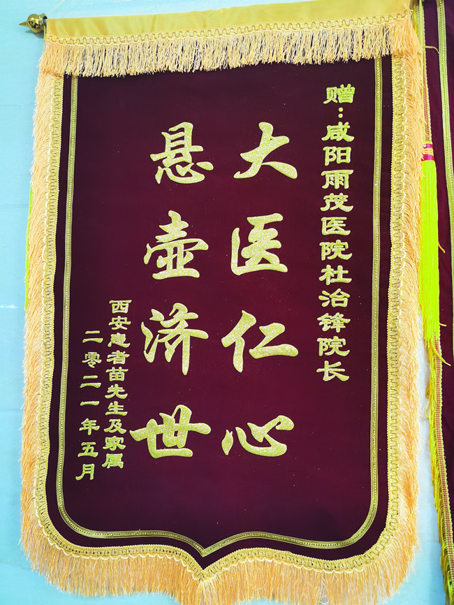 2021年5月,患者苗先生来到了咸阳雨茂医院门口,将一面印有“ 悬壶济世大医仁心”的锦旗和一封亲手写下的感谢信送到了杜治锋院长的手中,感谢信虽然只有数百字,但信短情长,表达出苗先生内心的感激之情。