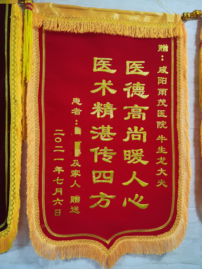 锦旗不仅仅是患者和家属对医务人员的赞许,更是对整个医院工作的肯定。每一面锦旗对咸阳雨茂医院全体医务人员来说都有着同等重要的分量,每一面锦旗都是对全体医务人员一点一滴付出的认可,同时每一面锦旗也是一种鞭策,激励大家今后更加尽心做好工作,全心全意为患者服务!